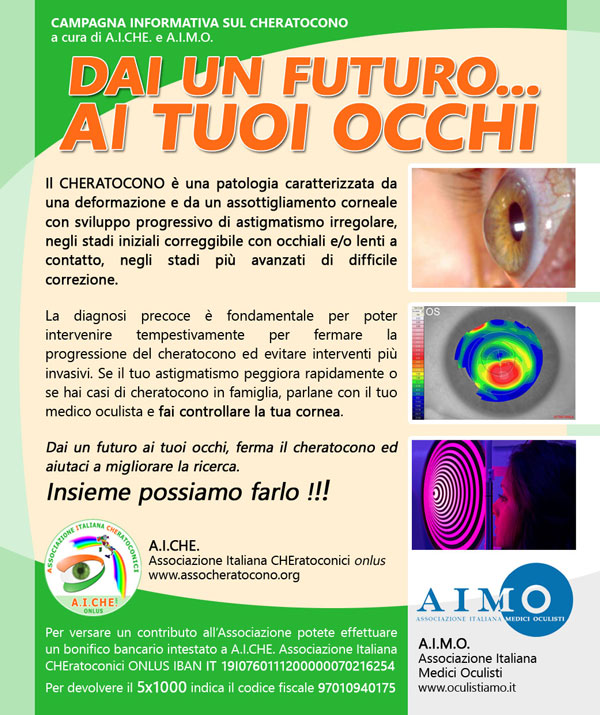 L'Associazione Italiana Medici Oculisti e l'Associazione Italiana CHEratoconici hanno in programma una campagna di sensibilizzazione per la diagnosi e il trattamento precoce del cheratocono, nell'ambito della quale verranno organizzate nei prossimi mesi delle giornate di screening gratuito per i familiari dei pazienti affetti dal cheratocono (i casi familiari sono molto frequenti) e per le persone che presentino i sintomi tipici della malattia.